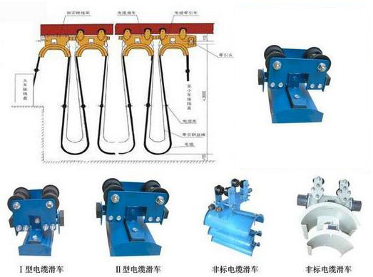 ZYGHC型工字鋼電纜滑車系列為起重機小車供電的一種導(dǎo)電形式。它有走輪、支架、托板組成,將軟電纜固定在托板上,由牽引架與電纜滑車同步,從而實現(xiàn)小車供電的目的。